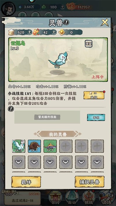 4、灵兽养成增强输出:捕获灵兽后,使用灵兽口袋对其进行升级,等级提升将有效加强角色的攻击能力。