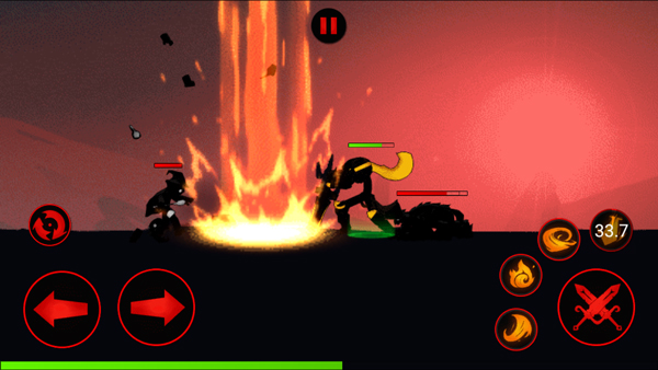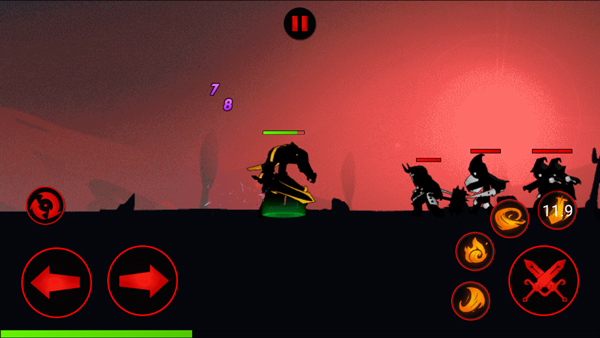- 加载完成后进入战斗界面,采用经典横版操作布局:左侧虚拟摇杆控制移动,右侧为普通攻击与技能按键;