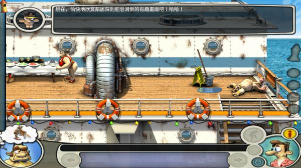 邻居离开左下后,拾取毯子并铺于右下舱口,返回左下捡信号弹;待其离开左上及右中,依次拾取玻璃碎片(地毯下有密码纸,包内有安眠药);邻居离开右下后,用玻璃碎片割断货物架绳索;在左上等待,待其接近右中楼梯口时迅速向下走,确保在其离开右下瞬间拾起鱼并奔向右上;上楼梯途中选中鱼,对左上花盆使用后立即折返,躲入右侧椅子(动作务必迅速,否则会被其母攻击);待邻居离开右中且其母入睡,冲至左下在水桶放鱼、取毛巾;返回右中后至左上,用毛巾清洁脏污玻璃墙,拾取鹦鹉身上的钥匙;回右中安装信号弹并躲入躺椅;待邻居被整蛊离开,进入船长室使用安眠药与密码纸,最终返回躺椅——恭喜通关!