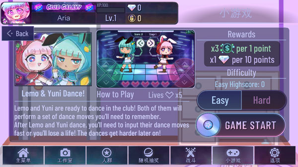 Lemo与Yuni会演示一组舞步,玩家需按提示顺序输入对应方向键(上下左右)。共有5次容错机会,出错一次即扣除一次。