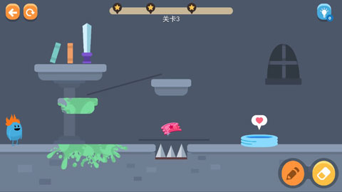 - 第3关:先在左上角画一条线阻挡武器掉落,再在豆人下方加一道防护线,避免其被尖刺击中。