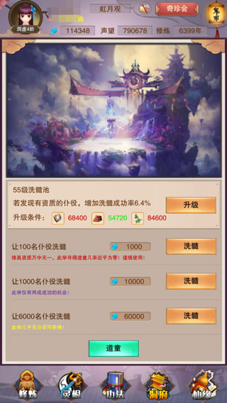 洗髓池等级决定可招募道童的上限,建议每级抽满后再升级。例如:21级最多可拥有47名道童,抽满后系统会提示“不可再抽”,此时再升至31级。具体策略如下: