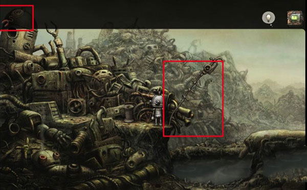 4. 点击磁铁与线圈上缠绕的绳索,分别收集两个关键道具;随后点击右侧竖直管道,机器人会将其压弯。