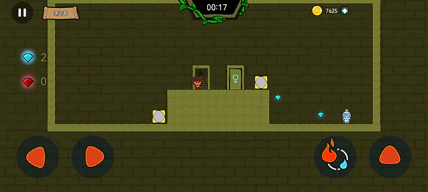 - 关卡中设有多种互动道具。例如,火娃需推动石块落下,为水娃创造可跳跃的平台。