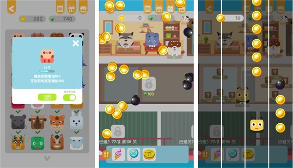 此外,点击动物头像上的游戏按钮,可触发专属互动小游戏——每个房间的小游戏内容各不相同,完成后同样可领取金币奖励。
