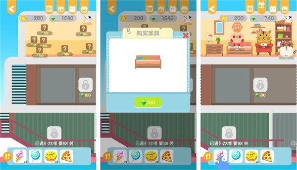 - 使用宝石解锁新房间并购买家具,为小动物们营造舒适居所;