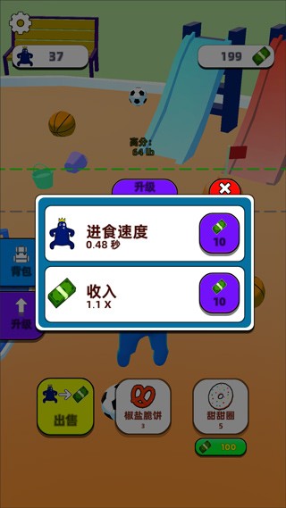 4、通过点击“升级”按钮,你可以提升彩虹朋友的进食速度和每次出售所获得的收入,加速你的成长进程。