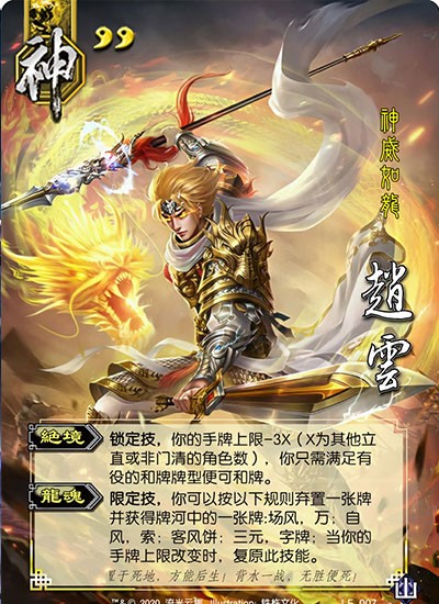 作为三国杀中第一个两滴血的男人,神赵云不可能没有生存能力。【龙魂】红桃为【桃】;方块当火【杀】;梅花当闪光;黑桃当无可挑剔。早期很难伤害神赵云,但现在很简单。一个界马超可以打神赵云。