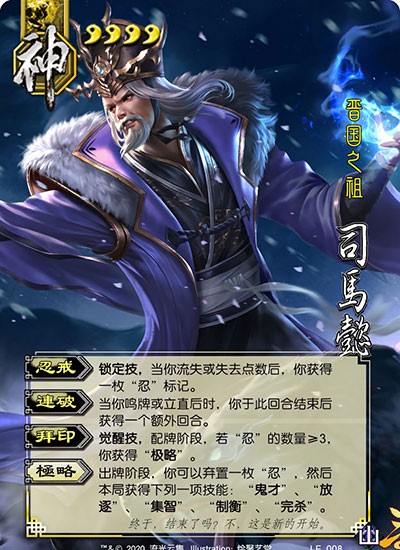如果单纯说强度,神司马懿不如神曹操,但神司马懿的优点在于适应性。神曹操适合多场比赛,不能在排位赛中发挥超强实力,但神司马懿可以。唯一的缺点就是摸牌。神司马懿没有增加摸牌的技巧,只能在觉醒后使用【智慧】或【平衡】。但是【忍戒】可以通过卖血来实现,所以很容易醒来。