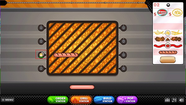 3、先将热狗放入烤炉,密切观察左侧指针颜色——当指针变为橙色时,立即点击热狗翻面(切勿烤焦,否则影响评分)。