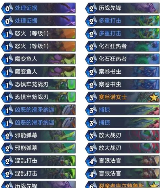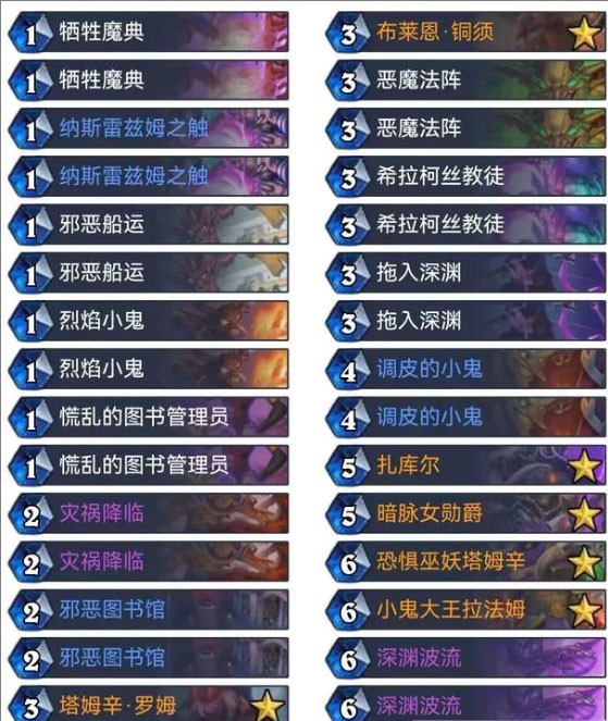这套卡组融合了小鬼术与诅咒术体系,兼具前期抢血与后期爆发能力。依靠“灾祸降临”的强大过牌效率,能迅速找到核心组件。即使场面被清,也能通过“铜须+希拉柯丝教徒”的Combo打出致命斩杀,是一套灵活多变的变速卡组。