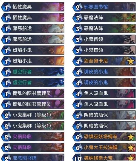 作为版本主推卡组,即便经历削弱仍保持强势。其铺场能力极强,配合高质量Buff如“邪恶图书馆”(单体强化)与“阴暗的酒保”(群体增益),能迅速制造难以处理的场面优势,真正实现“蚁多咬死象”。