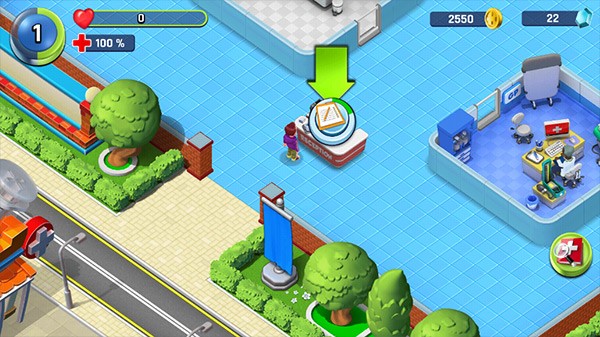 1、游戏初始界面中,接待处(如图)是患者进入医院后的第一站,确保此处有工作人员值守,避免患者滞留。