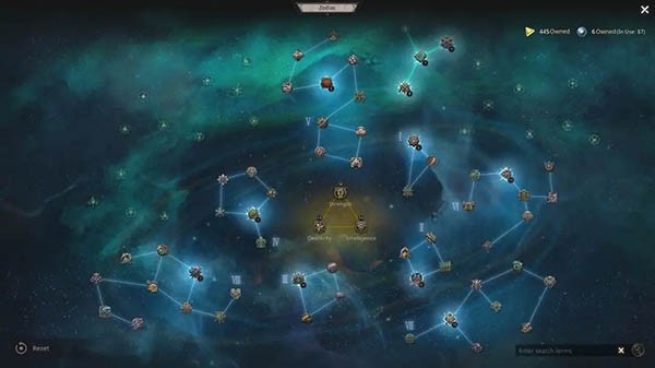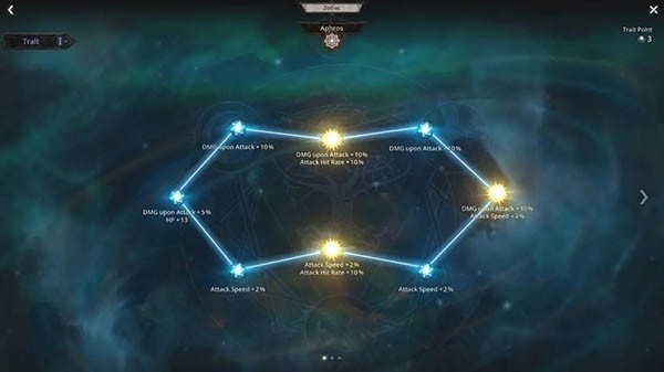 天赋系统:10级解锁,每升1级获得1点天赋点。十二黄道宫各自代表一组被动技能树,节点需沿已激活路径连接方可启用。部分专精天赋一经选择,将锁定其他分支,且设有投入上限。同样支持使用金币或装备重置。
