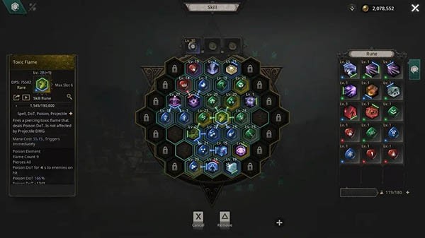 符文升级与附魔:通过狩猎怪物或拆解多余符文获取材料,可对符文进行升级。符文共分四个稀有度等级:一般、魔法、稀有、传奇。升级后效果增强,但同时会提高能力点需求与法力消耗。此外,使用符文精髓还能进行附魔,改变符文的插槽数量、位置或颜色,进一步拓展搭配空间。