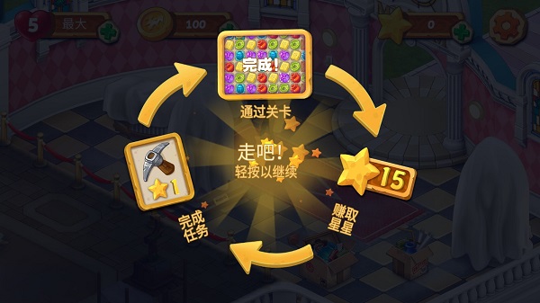 3、标准玩法流程为:挑战三消关卡 → 赢得星星奖励 → 完成对应任务,形成闭环式成长机制。