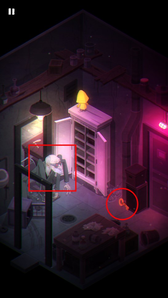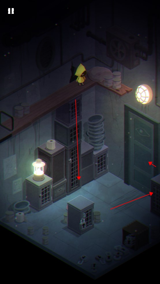 2. 打开柜子另一侧门,爬上顶部将装有钥匙的罐子推落摔碎,取得钥匙;注意怪物出现时需等待其离开后再行动。