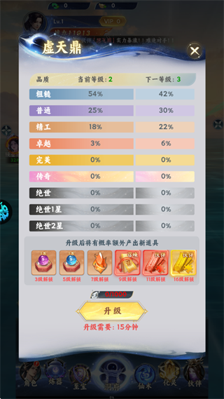 3、利用多余装备分解所得的材料升级【虚天鼎】,可显著提高稀有装备的产出概率。