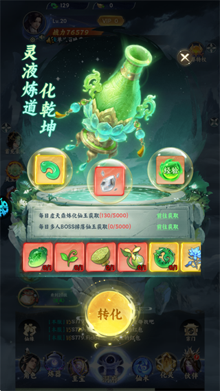 4、在界面左侧使用【灵液转化】功能,将各类材料转化为通用货币“灵玉”,用于多项养成系统。