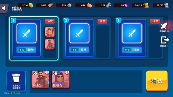 (1)在科技面板右下角点击“编队”按钮,进入编队界面。上方三个带武器图标的框代表可编辑的编队槽位,点击下方士兵即可将其加入对应队伍。系统共支持四个编队(向右滑动可查看第四个)。