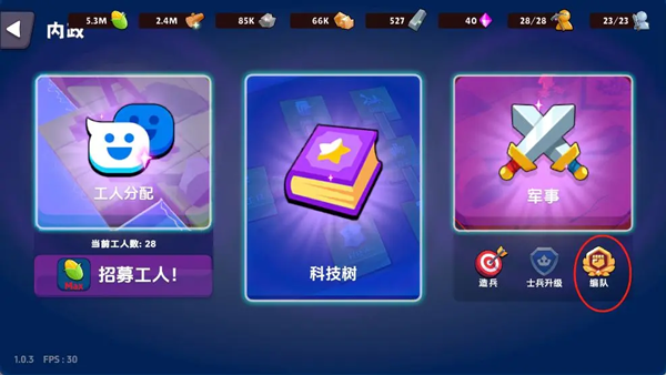 (1)点击“训练场”进入造兵界面,选择所需兵种。每种士兵消耗的资源不同,且拥有独特技能。