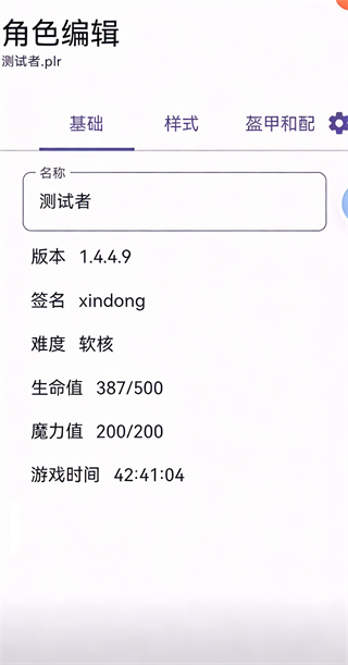 进入「角色编辑」→「基础」标签页,可修改角色名称、生命值/魔力值上限、游戏难度(软核/中核/硬核)等关键参数。