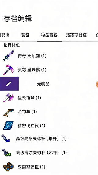 进入「存档编辑」→「物品背包」标签,可查看角色当前所有物品(含名称与数量)。