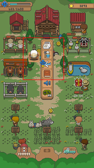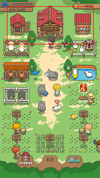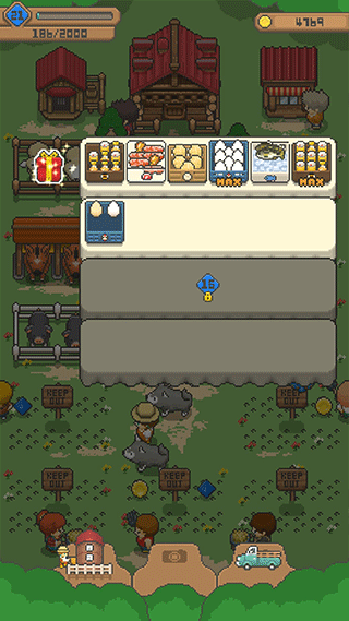 将牧场产出的农作物和动物制品摆放在卖场中,定时会有顾客前来购买,快速获取硬币用于设施升级与扩建。