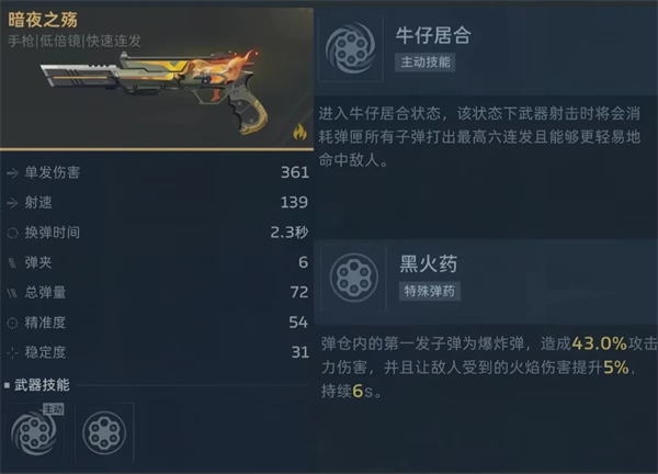 由副武器晋升为主武器,保留经典技能。主动「牛仔居合」可消耗弹匣实现六连发高命中爆发;被动「黑火药」使首发射击变为爆炸弹,附带火焰易伤效果。