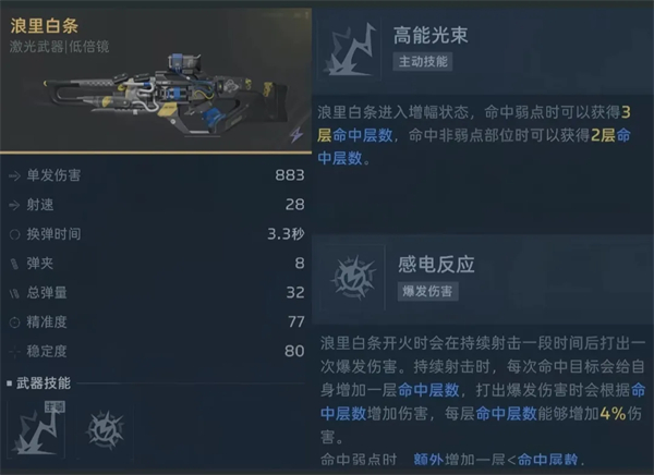 赛季20级奖励武器,单发伤害高达883点。主动「高能光束」通过命中叠层触发爆发;被动「感电反应」随层数提升伤害,满层输出极具威慑力。