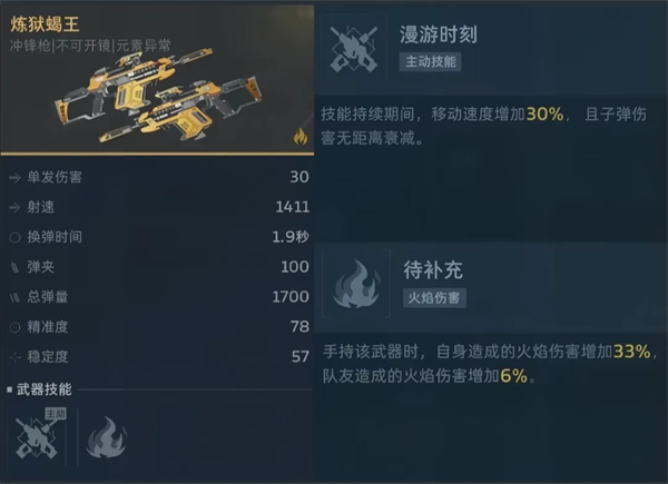 通行证专属武器,左键即可双枪齐射,操作更人性化。主动技能「漫游时刻」提供30%移速加成且子弹无距离衰减;被动「火焰伤害增幅」使自身火焰伤害+33%,队友+6%,堪称火焰队核心引擎。