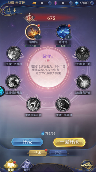 优先升级已解锁的核心主动技能如「裂地斩」「寒冰爆」,显著提升AOE伤害与清怪效率;合理分配技能点与材料,使用「一键升级」功能快速拉满技能等级,并随角色成长及时学习新技能。