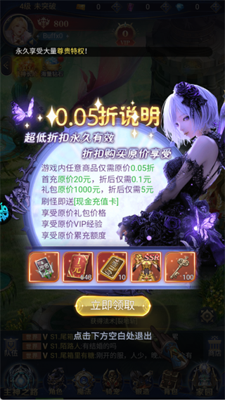 游戏内所有商品永久享受0.05折优惠:首充20元仅需0.1元,千元豪华礼包只需5元,且仍可获得原价对应的VIP经验与累计充值额度,性价比拉满!