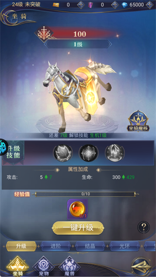 通过消耗坐骑经验道具,点击「一键升级」快速提升坐骑等级,直接增强攻击、生命等核心属性;当坐骑达到8级时,将解锁强力技能「生机」,提供续航或输出增益,实战能力大幅提升。