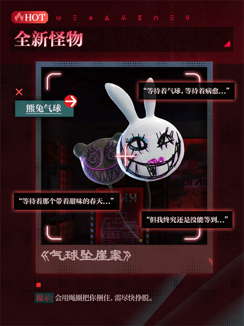 轻飘飘的气球下藏着扭曲笑容,遇见时别慌张,及时召唤队友或使用武器戳破即可脱险。