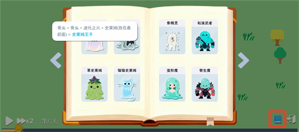 点击界面右下角的书本图标,可打开图鉴系统,查看每种史莱姆形态所需的进化素材与具体条件,便于提前规划进化路线。