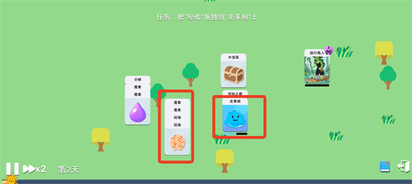 将获得的经验卡直接拖动至史莱姆卡上,即可为其提供经验值。当经验累积满后,史莱姆将自动升级。