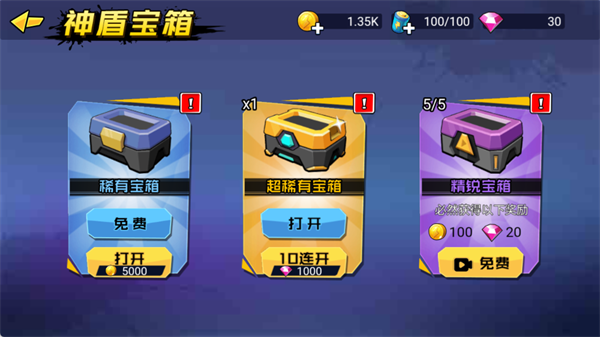 超稀有宝箱:需消耗钻石开启,有机会获得高级英雄或稀有武器。