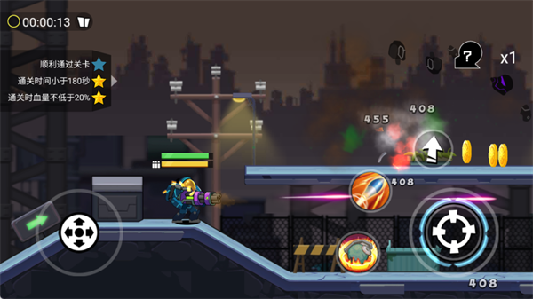 跳跃操作:部分关卡支持跳跃功能,点击跳跃键可翻越障碍或闪避弹幕攻击,灵活运用可大幅提高生存几率。