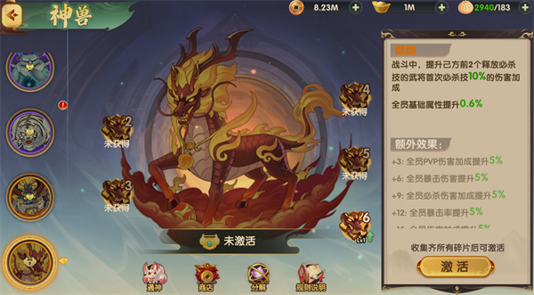 每只神兽需收集对应碎片进行激活,激活后方可整体解锁其增益效果。神兽碎片可用于升级单一神兽,每次升级均需消耗该神兽专属碎片。