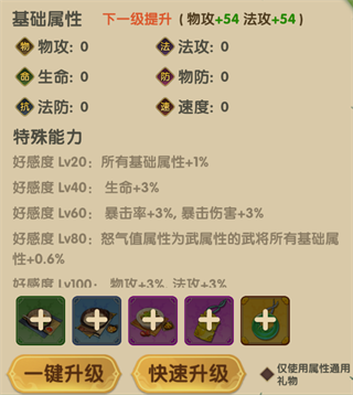 每位武将均设有独立的好感度等级,随着好感度提升,可逐步解锁专属属性加成,进一步强化其战场表现。