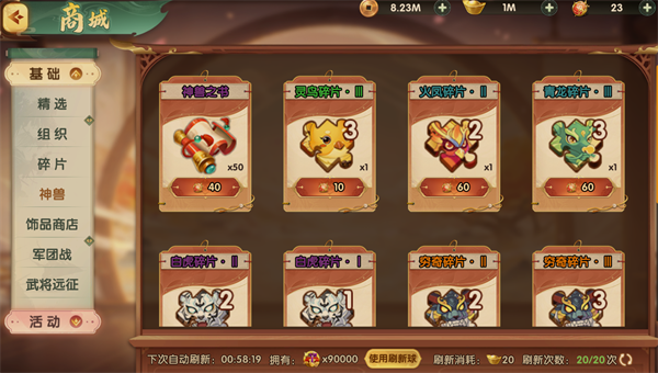 当神兽碎片等级与其自身等级一致时,方可进行进阶,解锁更高阶属性。此外,神兽商店支持使用分解所得的通用神兽材料兑换指定神兽碎片,助力定向培养。