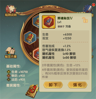 每位将领可装备六本秘籍,同样划分为白、绿、蓝、紫、橙、红六档品质,品质越高,附加属性越强。秘籍不仅提供1-2条固定属性与随机属性,还可激活2件套或4件套的套装效果,显著增强特定战术方向。