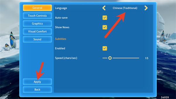 1. 在设置菜单中选择上方的Language(语言),通过左右箭头切换至Chinese(Traditional),随后点击左下角Apply(应用设置)确认更改。