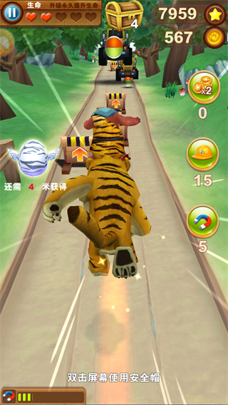 - 丛林赛道:作为初始赛道,难度较低,障碍稀疏。主要挑战来自移动障碍物,如奔跑的老虎、行驶的汽车及滚动巨木,需提前预判走位。