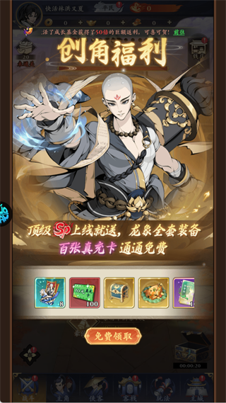 新玩家创建角色后,立即获得SP天山梦郎、全套龙象装备以及百张真充卡,无需肝氪即可快速组建强力阵容,轻松开启你的江湖征程。