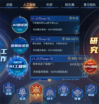 6、当【研究概论】与【活力研究】均达200级以上,应转向【信息技术】分支,优先研发【学习算法】【GPU架构】【芯片制程】。建议【学习算法】达到150级后立即转职至“人工智能”相关工作——该路径能显著提升AI类职业收益,是前期最具盈利效率的发展方向。