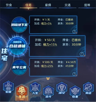 5、资金充足后,可优化“住宅、饮食、交通、提神”等生活配置以获取额外属性加成。其中“提神”效果具时效性,冷却结束后需手动重新开启