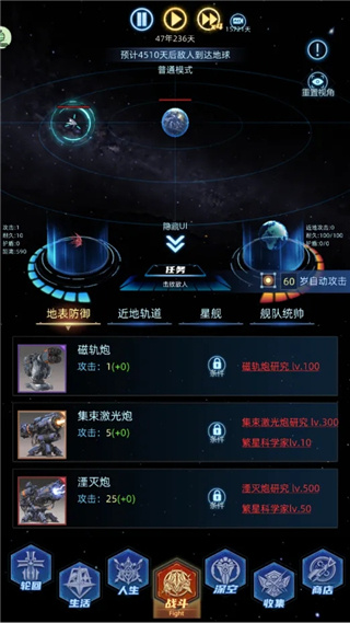8、关于敌人与星球危机:敌人首次于40岁登场(首轮为39岁),直接发起攻击;此后每60岁进攻一次。地球初始防御值为100,归零即触发轮回重置。