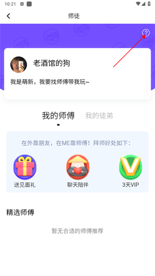 - 在师徒界面中,点击右上角的“?”帮助按钮。
